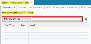 - OPPORTUNITY - Tag criterion from the search screen of opportunities in the Desktop Application > Management > Sales > Opportunities > Multiple-selection criteria section;