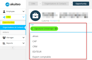 - Tags field of an opportunity on the Web Portal, accessible in CRM > Opportunities.