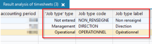 In the timesheets analysis (Dashboard > Labor > Timesheets Analysis), when the EMPLOYEE - Type of job grouping criterion is applied, the job type is displayed in the results. Job types are set up from Setup > General setup > Resources and Labor > Job types.
