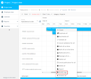 From the Project view and Employee view menus (and the Calendar menu if the PLG_HORODATE management rule is enabled) menus in Project, tags can be entered in the form when creating a scheduled item.