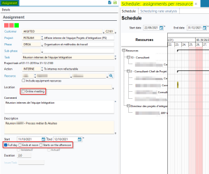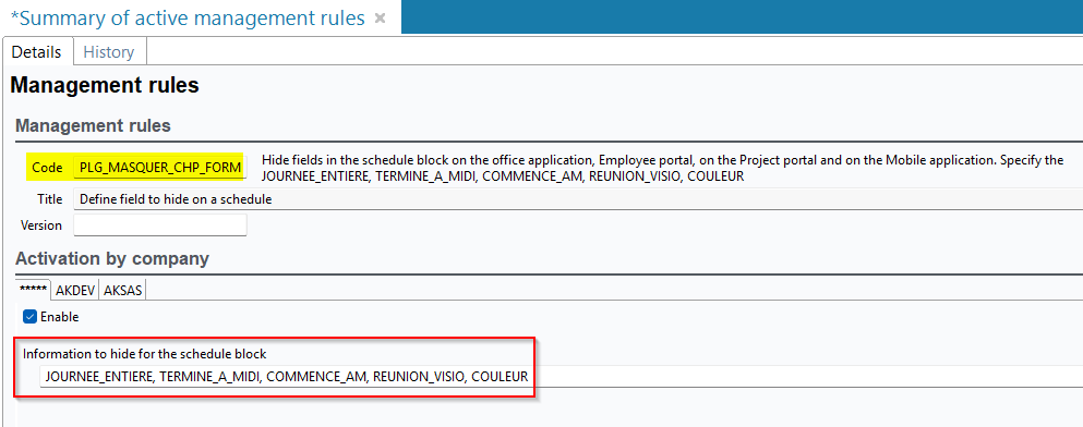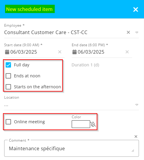The PLG_MASQUER_CHP_FORM management rule has been added and is used to hide one or multiple fields among Full day, Ends at noon, Starts on the afternoon, Online meeting and Color on the scheduled item form: