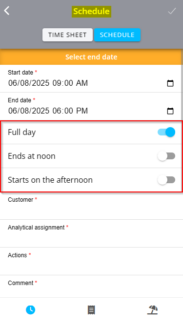 The Full day, Ends at noon, Starts on the afternoon checkboxes are shown only when the PLG_HORODATE management rule is enabled.