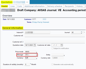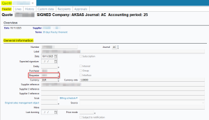 On a quotation (Management > Purchases > Quotations) or a purchase order (Management > Purchases > Purchase orders) > Header view > General information section, the requester of the object can be specified in the Requester field.