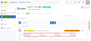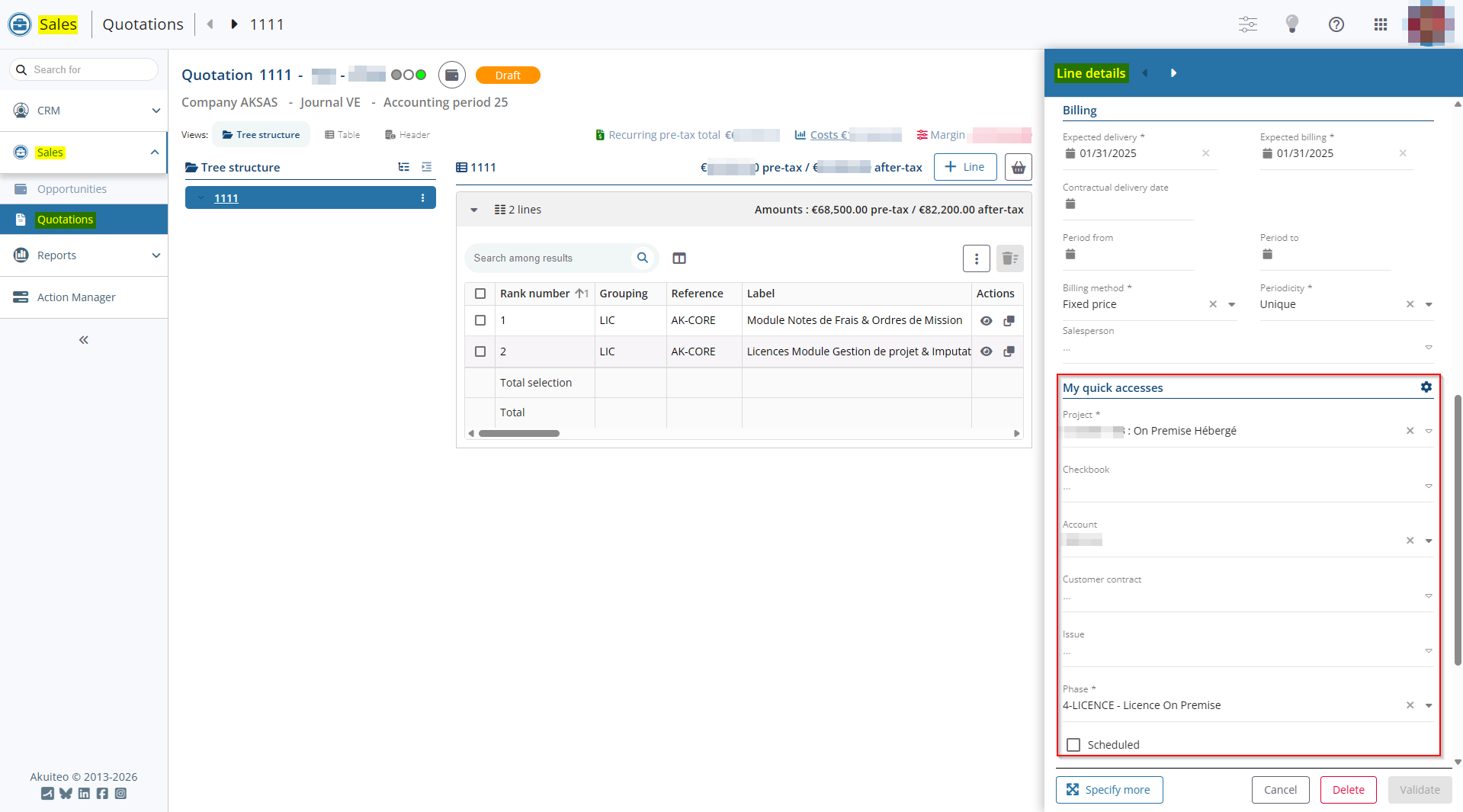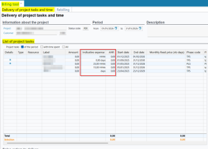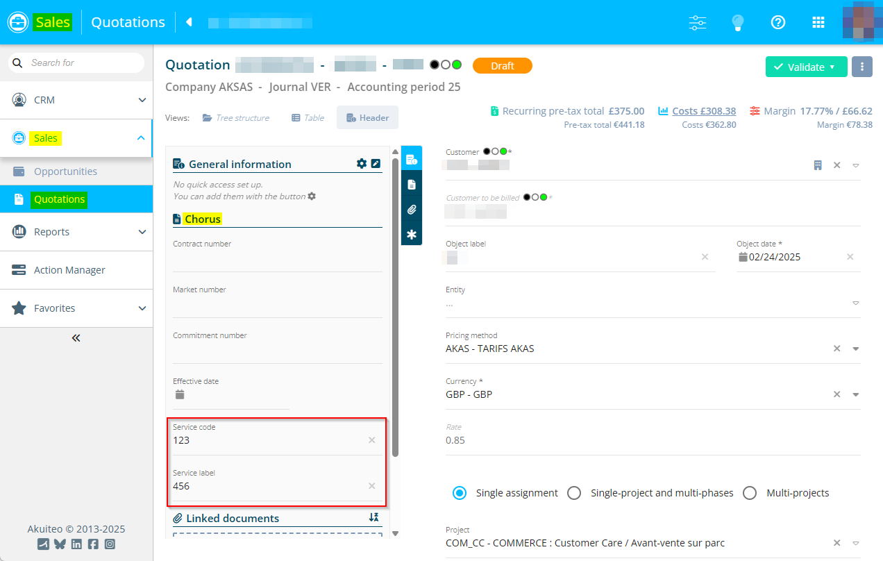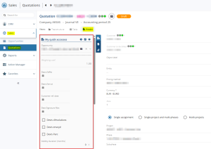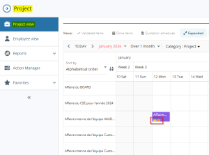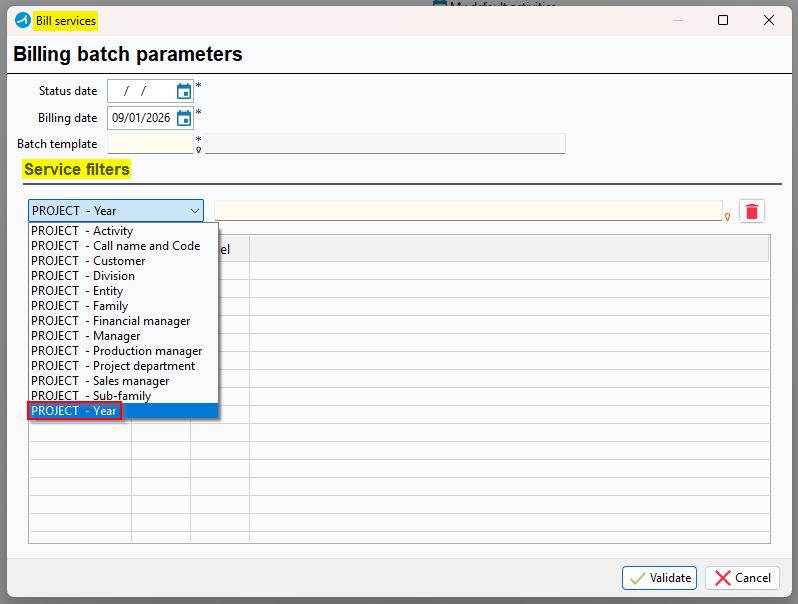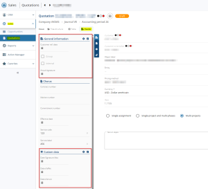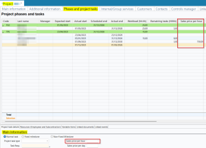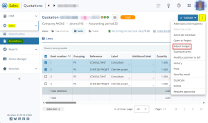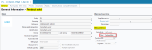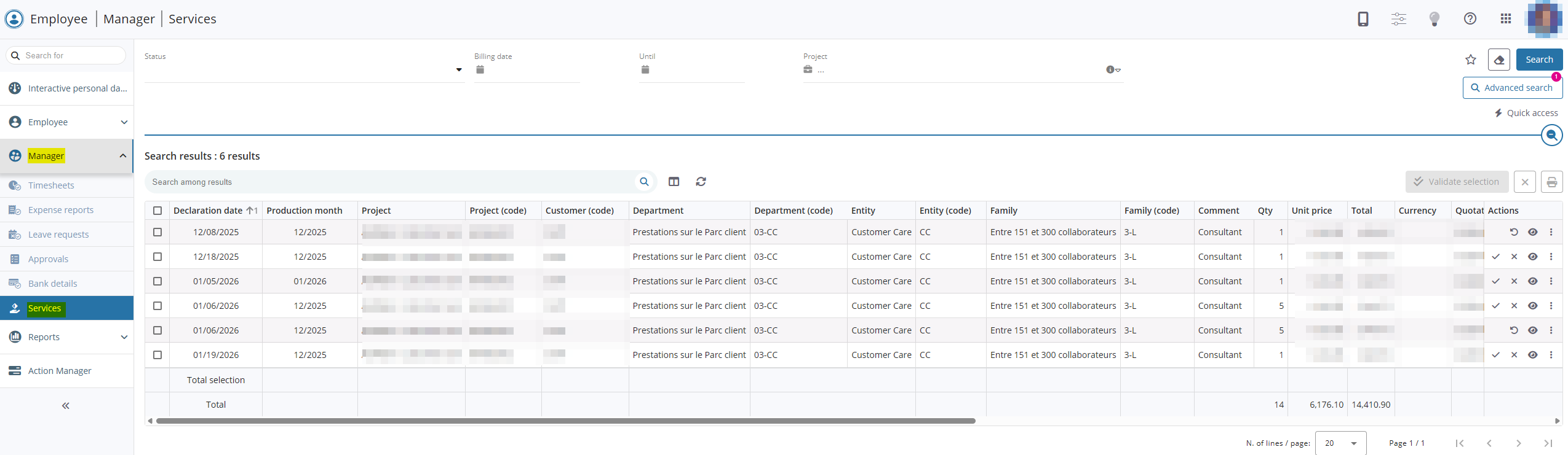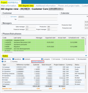 From now on, it is also possible to access this menu from the Desktop Application. The Services validation hyperlink has been added to the 360 degree view of a project > Sales section and automatically starts a search of the Manager module > Services menu with the Project search criterion specified with the name of the current project.