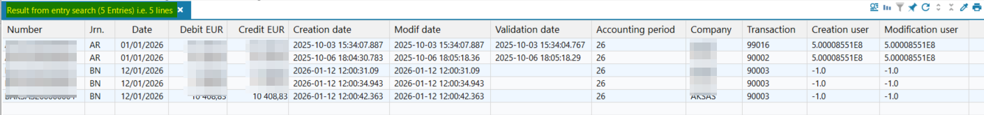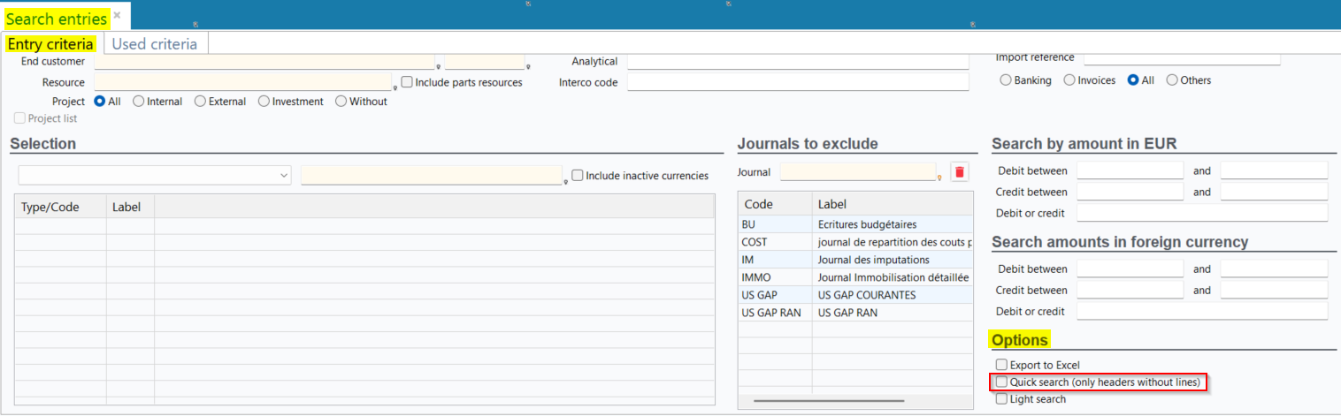 In the entries search screen (Accounting > Entries > Entries), the Quick search criterion has been replaced by the Quick search (only headers without lines) criterion in the Entry criteria tab > Options section.
