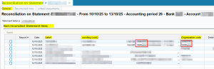 After importing a bank statement, the third party for each imported line (General tab > Non-reconciled Statement lines section > Organization code column) is automatically determined and specified: