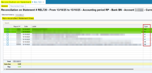 After importing a bank statement, some transaction codes are not recognized, and the corresponding imported lines are therefore assigned the default type AU (Other) in General tab > Non-reconciled Statement lines section > Type column.