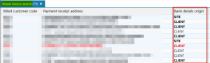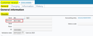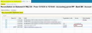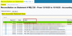 - If any of the columns Label, wording (cont.), Comment, Discount reference, or Sold-to-party account contains the reference specified in the customer record sheet (People > Customers/Prospects) or supplier record sheet (People > Suppliers > Finances tab > Terms and conditions section > Reference on bank statement field), otherwise,