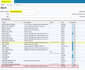 In the ImportReleveBancaire batch (Tools > Setup > Batches > Batch creation and modification), the VIR_CLIENTS_AUTO parameter has also been added and corresponds to the Automatic creation of customer bank transfers option. The parameter can be set to True or False depending on whether the option should be enabled or not for statement imports processed by the batch.