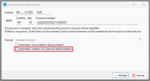 In the import window, the Automatic creation of customer bank transfers option has been added and allows the import to automatically create customer receipts corresponding to the transfers and charge them to the respective invoice.