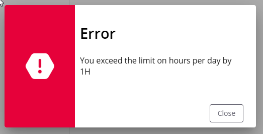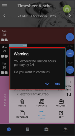 Now, on Akuiteo Mobile, the employee is either warn or blocked (depending on the setup) when they transfer a scheduled item into timesheets and the maximum number of hours is exceeded.
