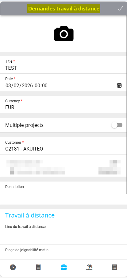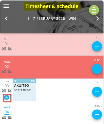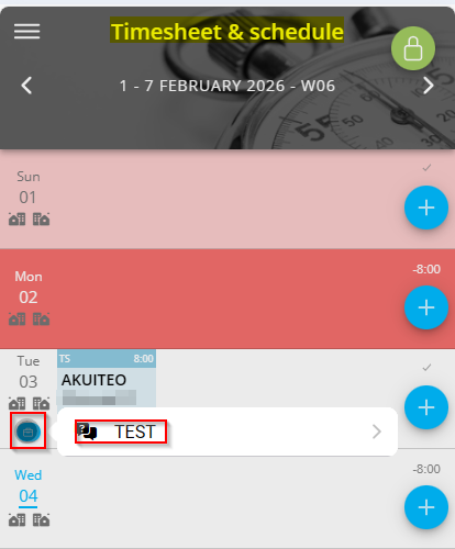 An expense or custom request can be created from a timesheet or scheduled item in Akuiteo Mobile > Timesheet & schedule by touching the relevant item then by touching + EXPENSE or + REQUEST.