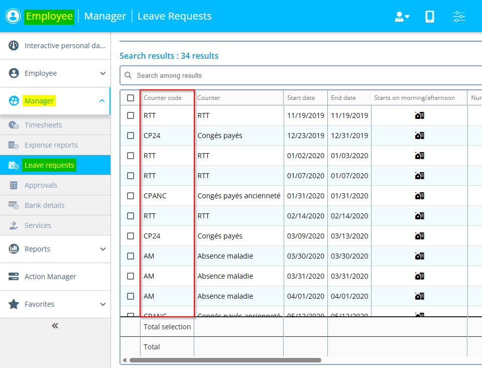 | Portail collaborateur > Manager | Employee Manager Leaves | Gives access to the Manager > Leave requests menu of the new Web Portal. This Leave requests menu offers the same features available in the Web Portal's current Validations > Leave requests menu with a new interface. | 5.0.14 |