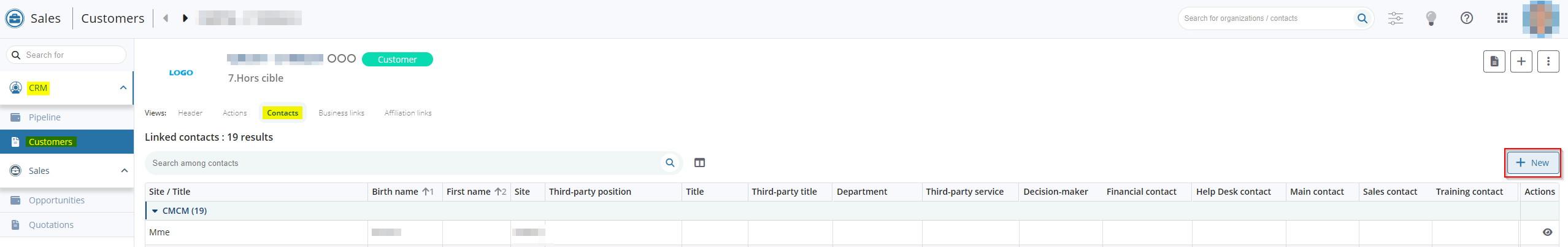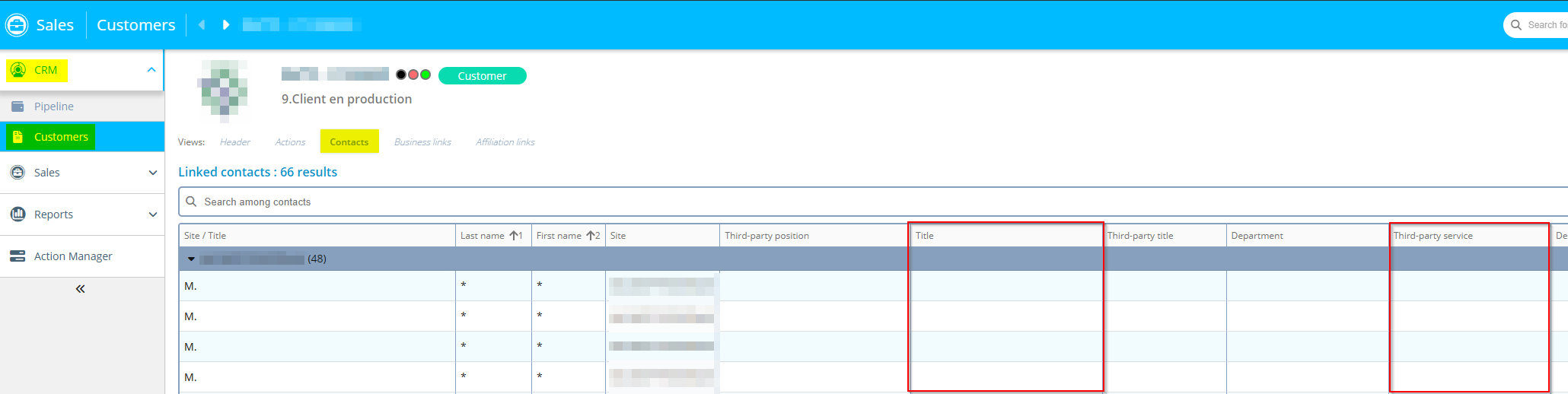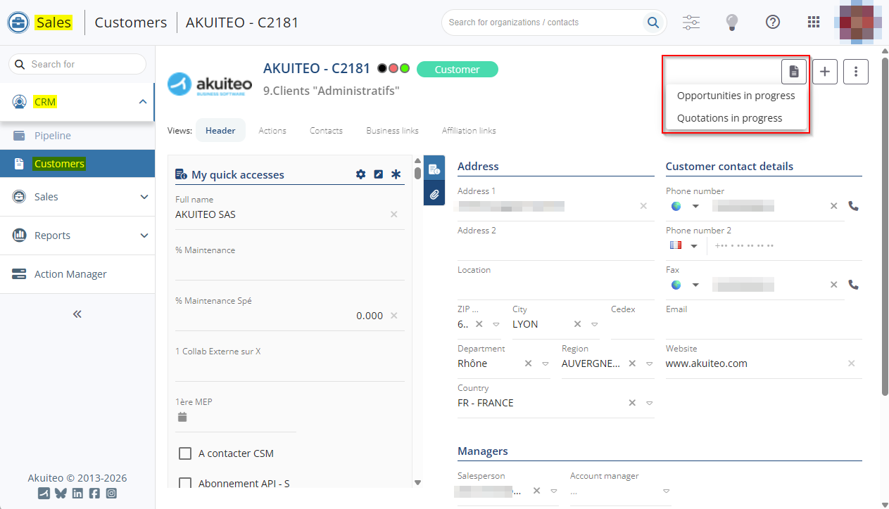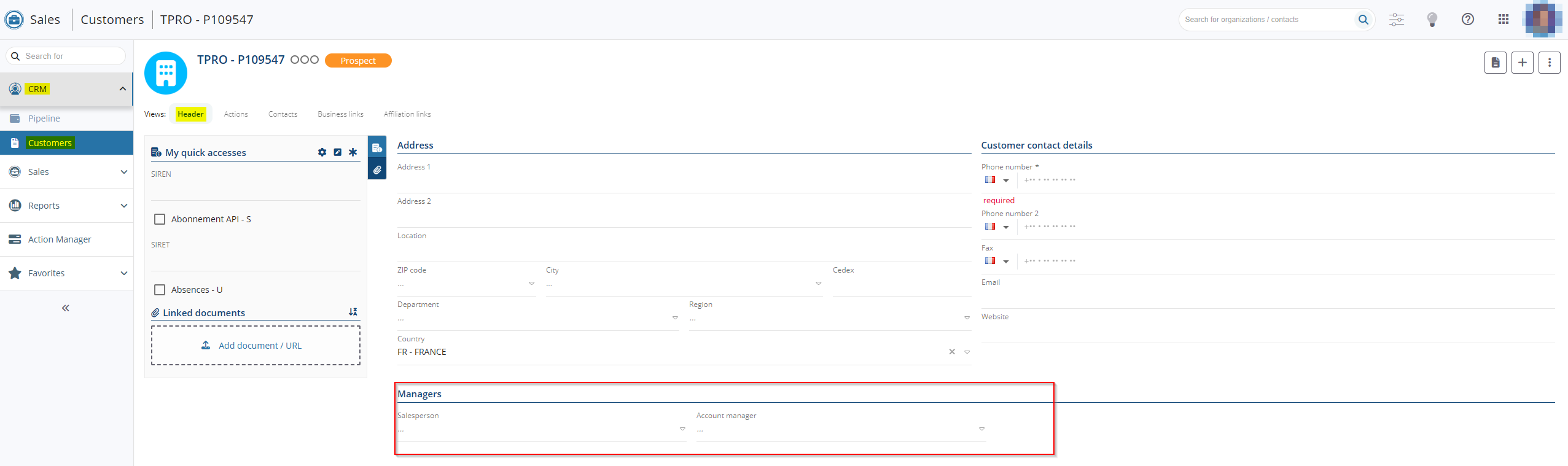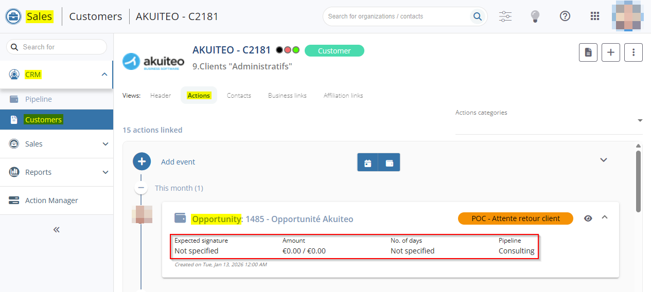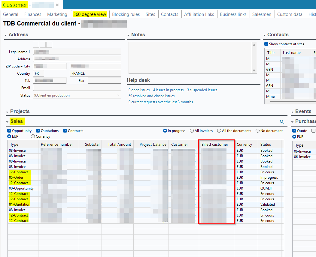 Previously, from the 360 degree view tab > Sales section of customers/prospects (People > Customers/Prospects) and projects (Management > Projects), the Billed customer column displayed the billed customer only for invoices and was empty for other objects.