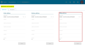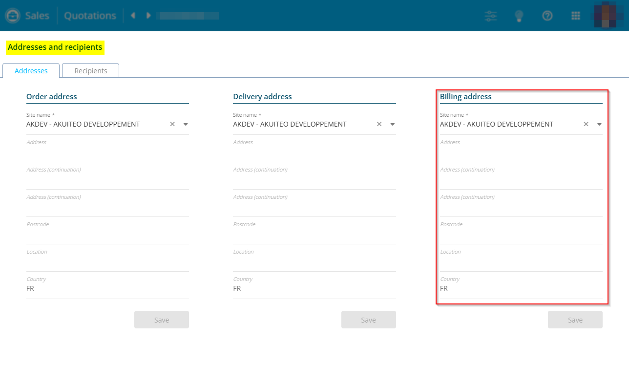 Before, when the billing site of an invoice (Management > Sales > Invoices > Header tab > Customer section) was modified, an informational message asked the user to manually verify if the recipients of the invoice needed to be updated (Recipients tab).