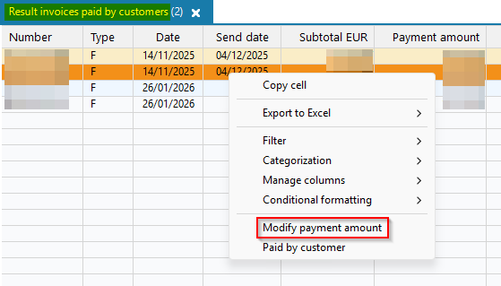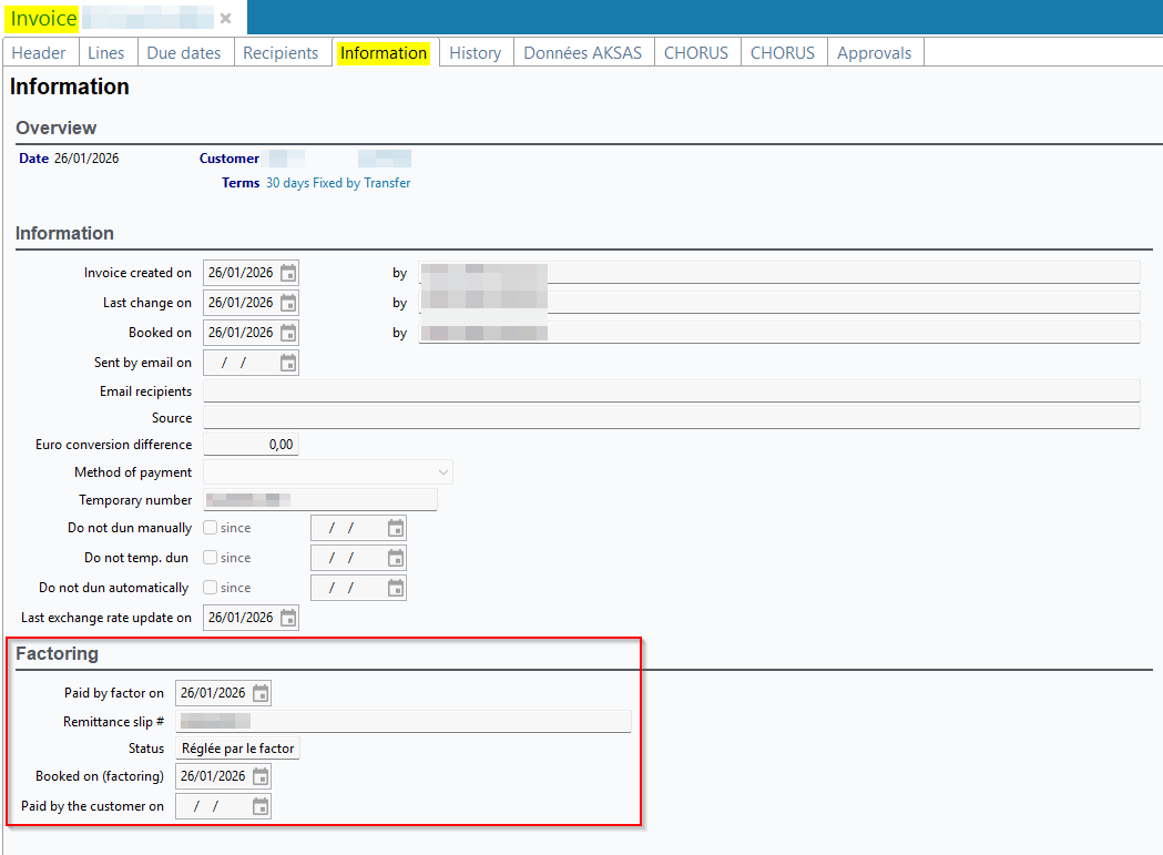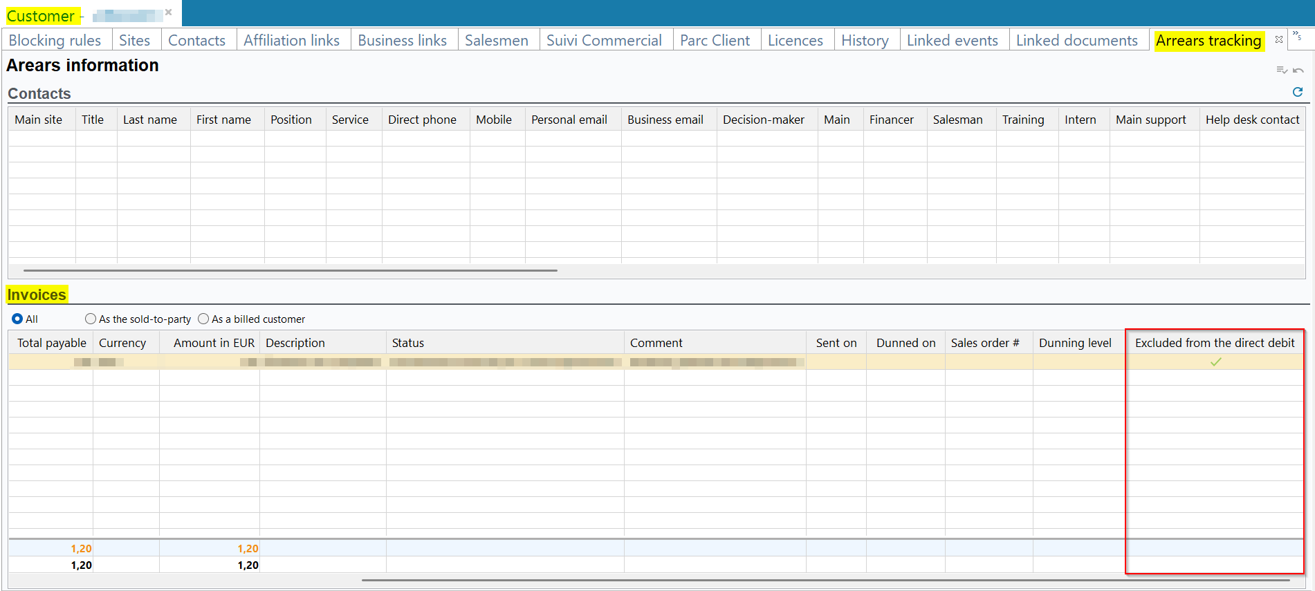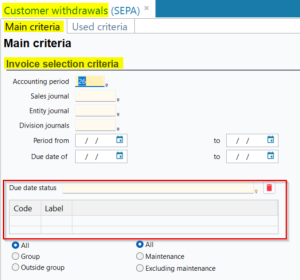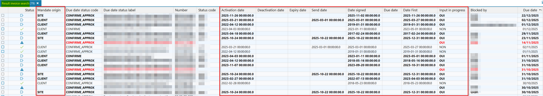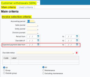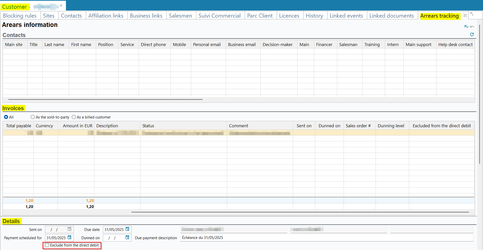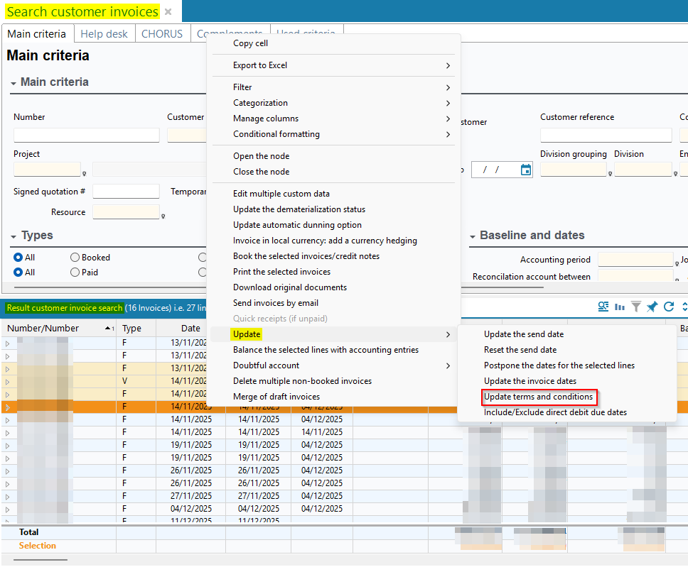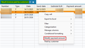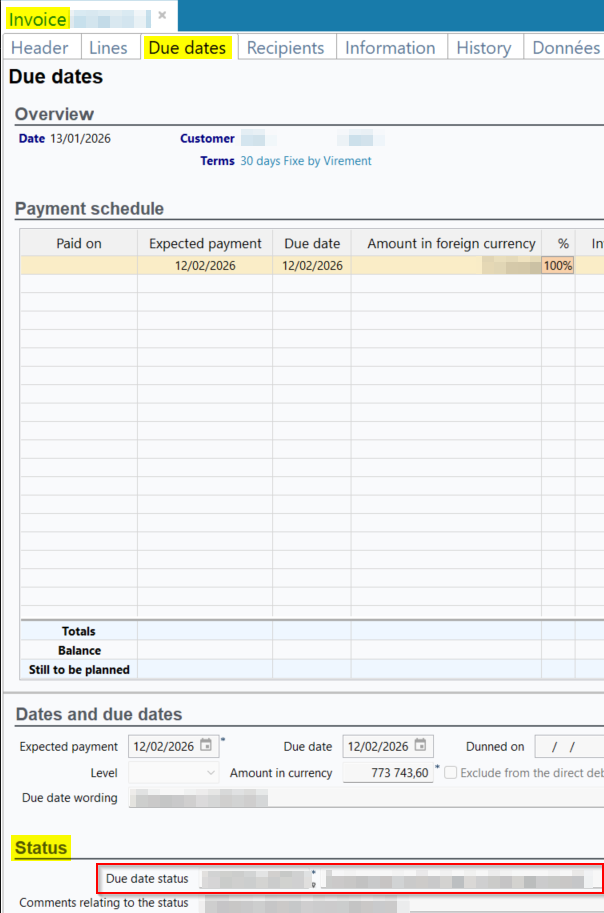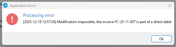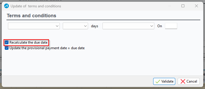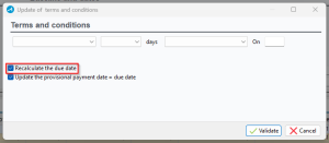 From now on, a restriction has been added, and payment terms can no longer be modified for invoices included in a direct debit, even if the Recalculate the due date option is unchecked.