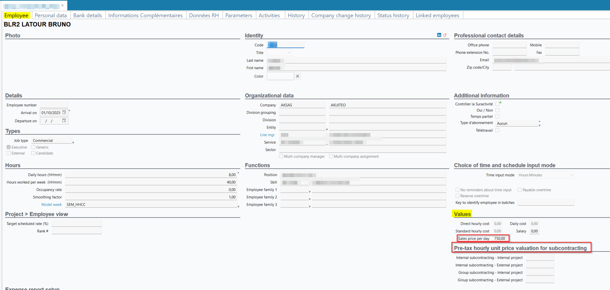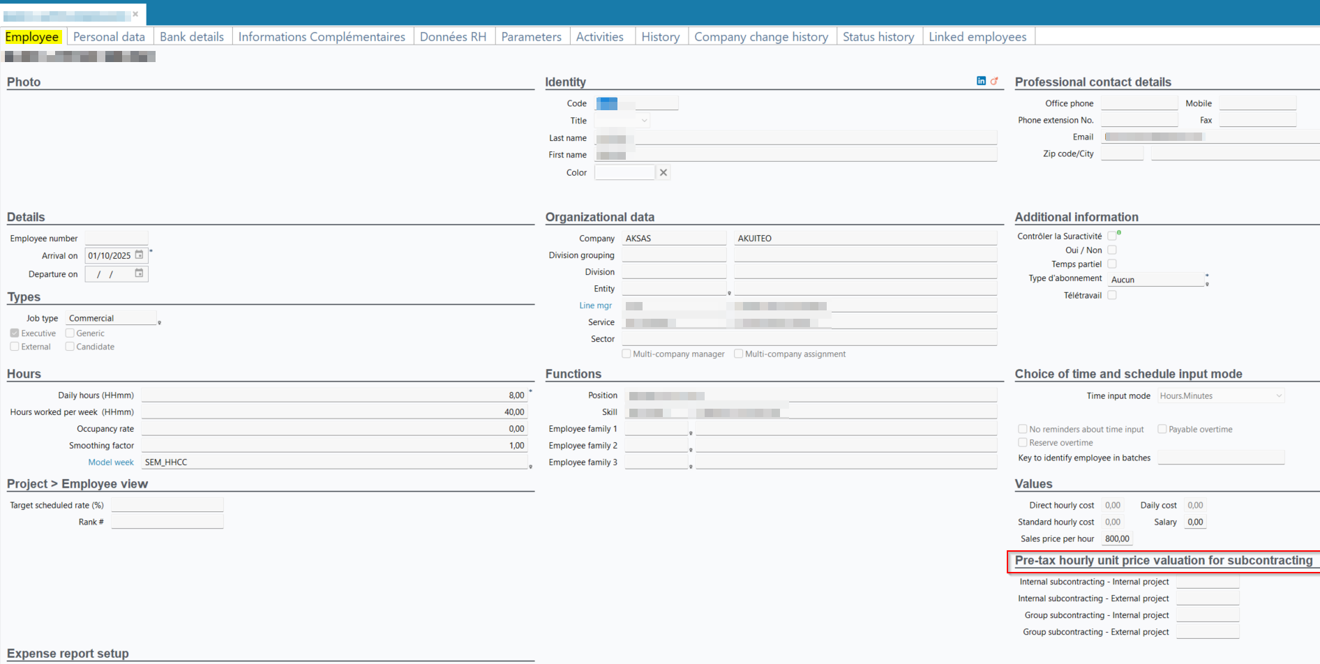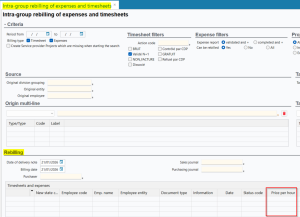 The intra-group rebilling (Management > Sales > Intra-group rebilling of expenses and timesheets) allows you to rebill timesheets and/or expenses of an employee of one company to another one (internal or external).
