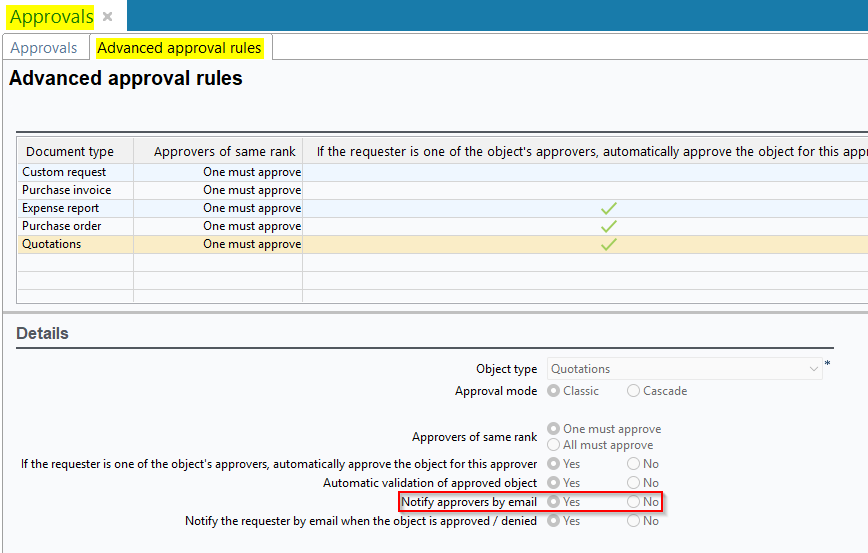 Now, the Requester checkbox has been added in the Approvers section for approval rules related to quotations and purchase orders (Data selection section > Object type field > Quotations and Purchase order).