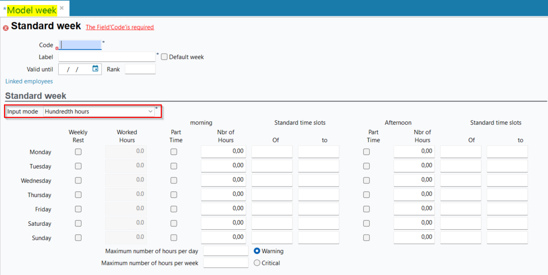 - The Warning or the Critical option can be checked in order to either warn the employee or prevent them from entering a timesheet when the employee exceeds the maximum number of hours on the day and/or the week.