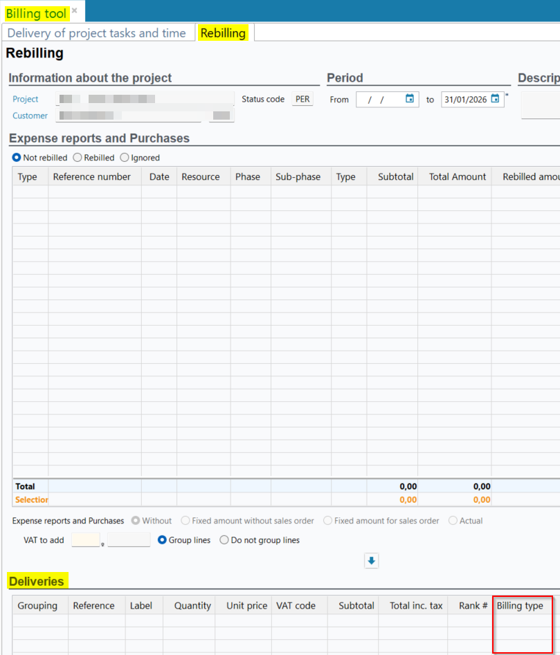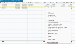 The Merging draft invoices feature (Management > Sales > Invoices > right-click from the search results > Merging draft invoices) and the FusionFacture batch (Tools > Setup > Batches > Batch creation and modification) allow you to merge non booked draft invoices into one draft invoice, according to the grouping criteria selected.