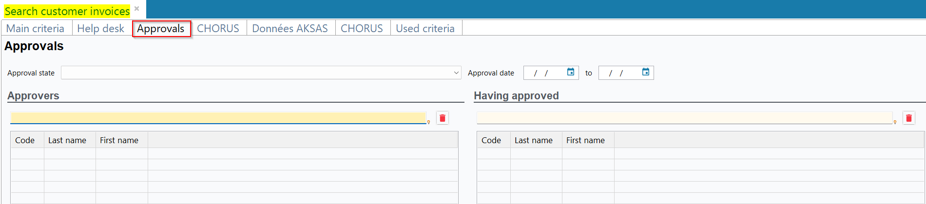 In the search screen of invoices, the Approvals tab has also been added. It allows you to define search criteria for draft invoices, according to the approval status, approbators who need to approve the invoice or who approved the invoice.