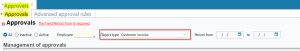 Thus, in the setup screen of Approvals > Approval tab > Data selection section and Advanced approval rules tab > Details section, the Customer invoice value can be selected in the drop-down list of the Object type field to create an approbation rule.
