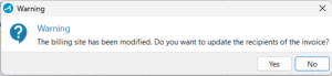 From now on, an alert message ask the user if they want to automatically update the recipients when they click on Yes. In this case, initial recipients are overwritten with the contacts identified as recipients of the invoice on the selected billing site (Customer site > Contacts tab). If the new billing site does not have any contact identified as recipient of the sales invoices, the initial recipients are deleted and the Recipients tab remains empty.