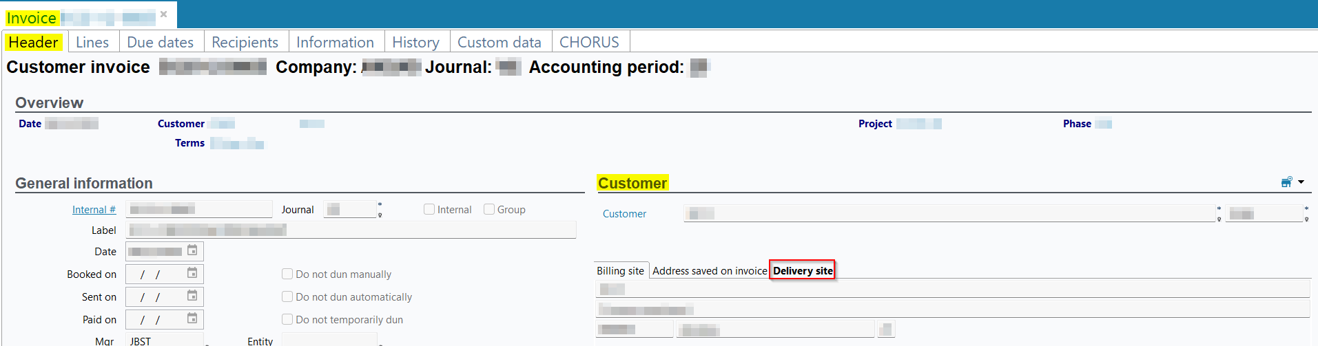 Before, when duplicating an invoice (Management > Sales > Invoices), the default Delivery site (Header tab > Customer section) was automatically retrieved on the duplicated invoice, even when it was modified on the original invoice.