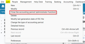 Previously, from the screen of the current accounting period (Tools > Setup > General Setup > Accounting > Accounting periods), the Close the accounting period feature available from the Edit menu was visible only to users with a super administrator profile.