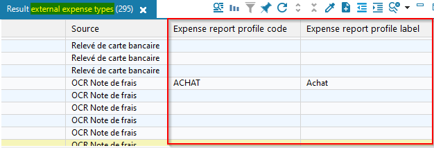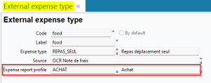 In order to solve this, the Expense report profile field has been added on the external expenditure types record sheets. From now on, a external expenditure type can be associated with an expense report profile and can also have the same code as another external expenditure type. So it is possible to associate a same external expenditure type code to multiple expense types.