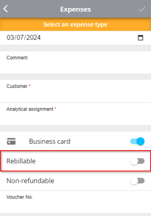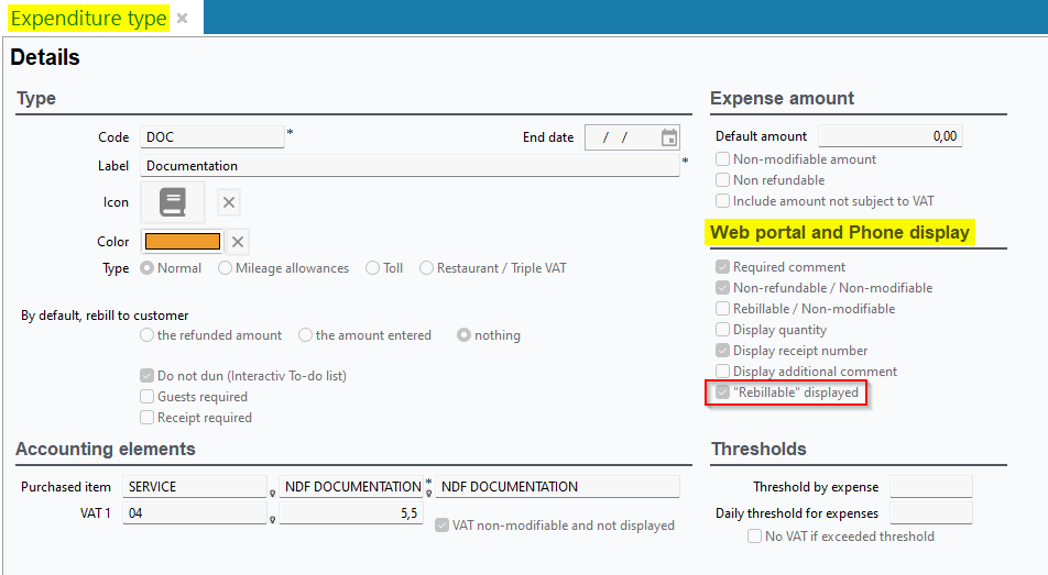 In the setup of expense types (Setup > General setup > Expense reports > Expenditure type), the "Rebillable" displayed has been added to the Web portal and Phone display section. By default, the option is enabled and therefore preserves the original behavior of Akuiteo.