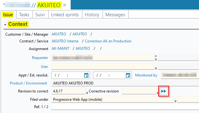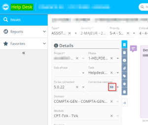 On the simplified issues (Desktop Application > Help Desk > Issues search), in the Context section, the  icon allows you to specify the Corrective revision field with the last revision linked to the revision version to be corrected.