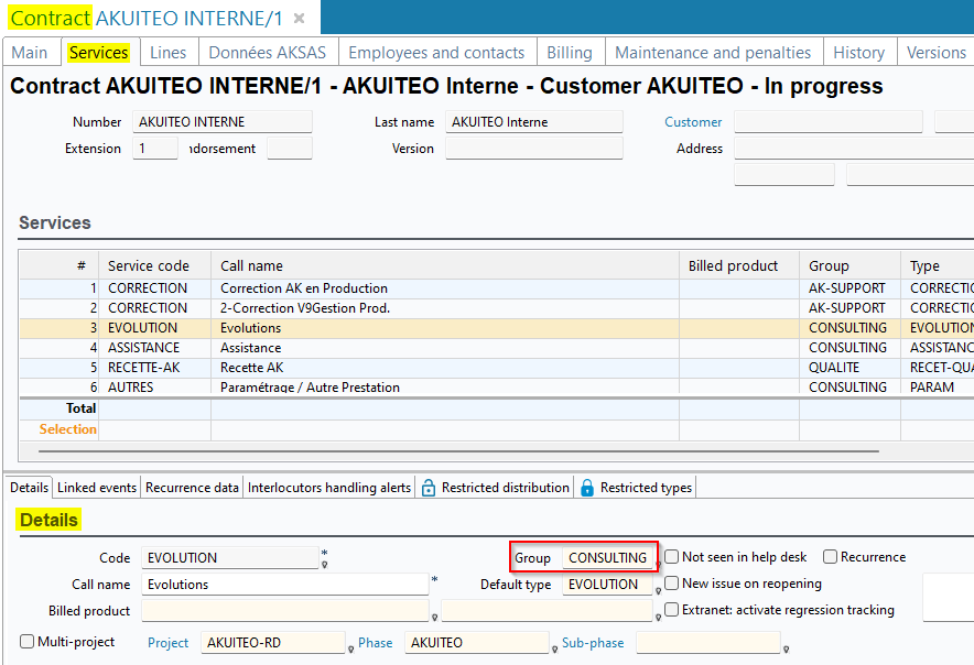 - When the user specifies the Product, the Group field is automatically specified with the group specified on the service line corresponding to the product. If the group was already specified on the group of the service, it is automatically replaced by the group of the service line corresponding to the product.