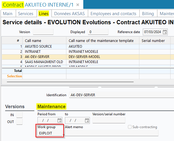 - on a service line, by going on the Services tab > double-click on the service line > Maintenance section > Work group field.