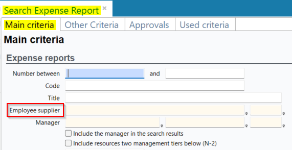 - The expense reports search screen in the Main criteria tab > Expense reports section;