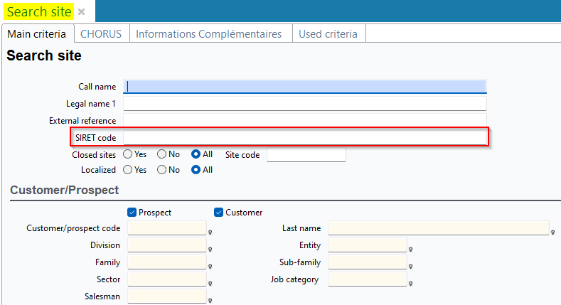 In the search screen of sites (People > Sites), the SIRET search criterion has been added and is used to search for sites based on their SIRET number.