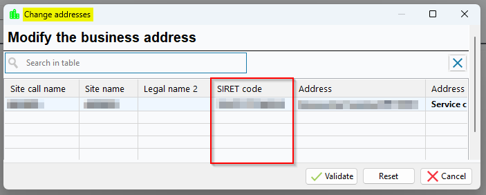 Furthermore, the SIRET column has been added to the window used to select an order address, a delivery address, a reception address or a billing address. This window can be accessed from the  icon in the header of the following objects:
