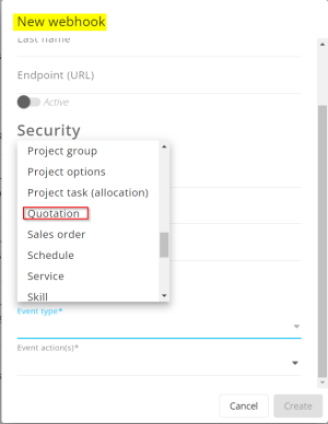Then, in the Administration console > Configuration > Webhooks > New webhook > Event type field, the Quotation and Opportunity event types have been added.
