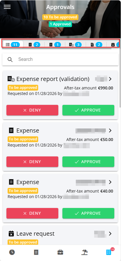 Approvals menu has multiple tabs depending on the approval requests: