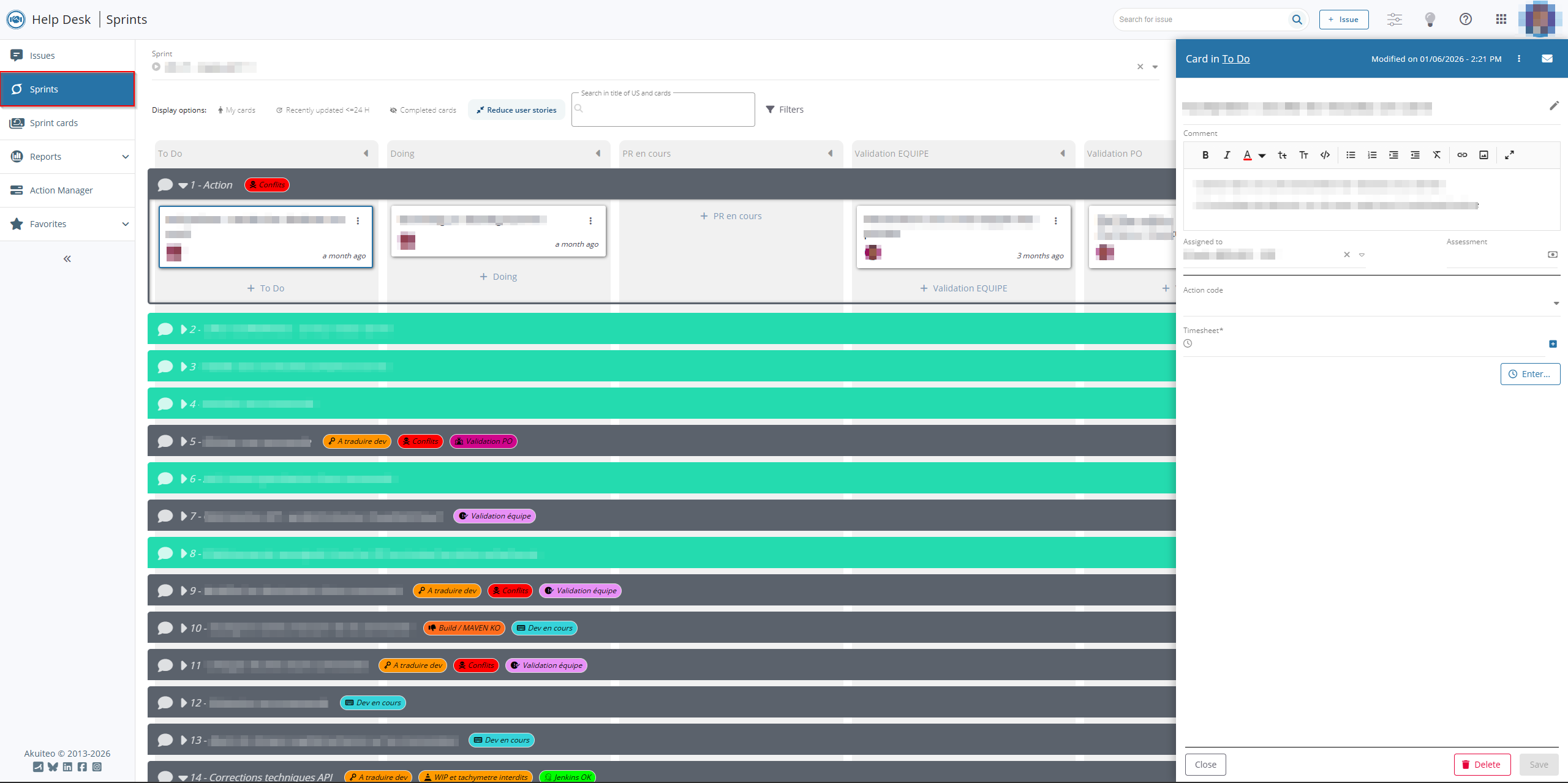 Cards represent development tasks and are grouped in user stories (US) inside a sprint. Two menus can be used to manage sprint cards: