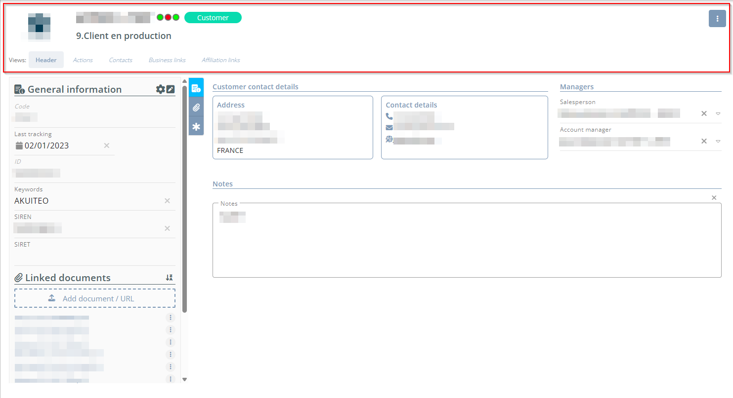 Reference For more information about the Header view of the customer or prospect, refer to Managing the Header view of a customer or prospect. |