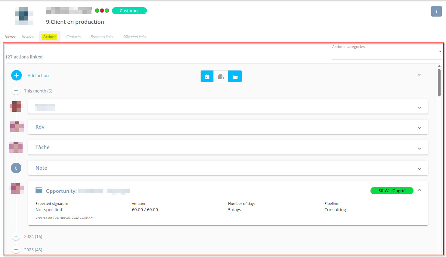 Allows managing actions and displaying the history and opportunities of the customer or prospect. Reference For more information about the Activities view, refer to Managing the Activities view of a customer or prospect. |