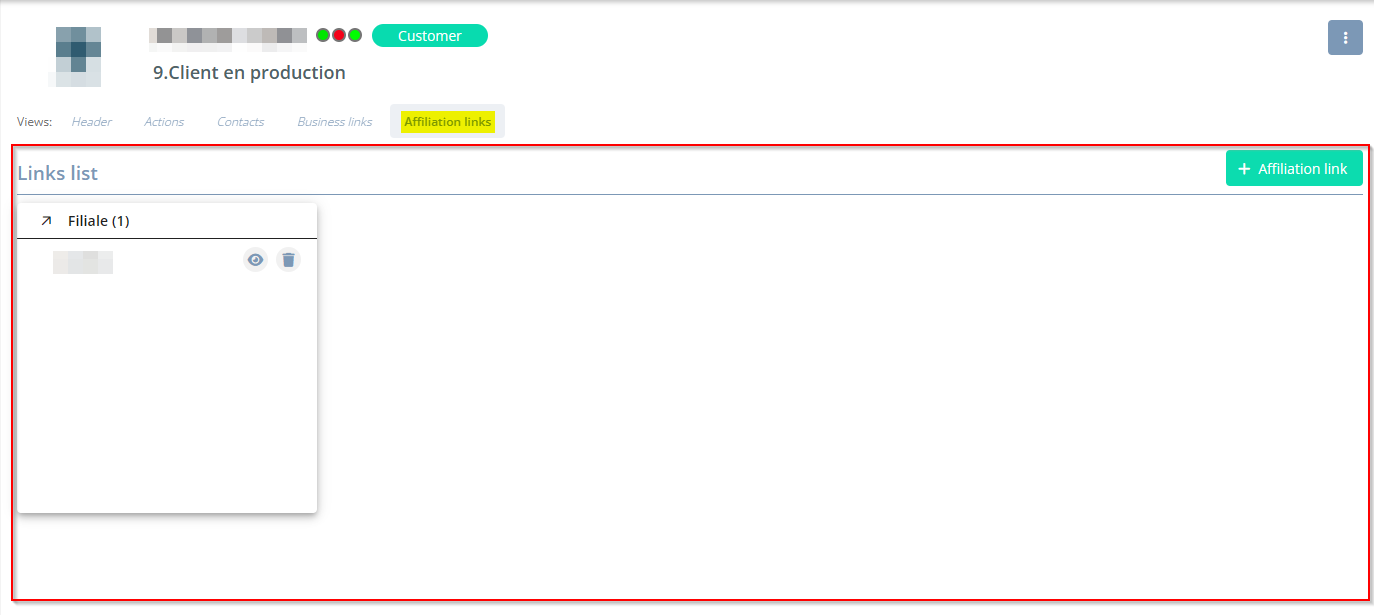 Allows managing the affiliation links of the customer or prospect. Reference For more information about the Affiliation links view, refer to Managing the Affiliation links view of a customer or prospect. |