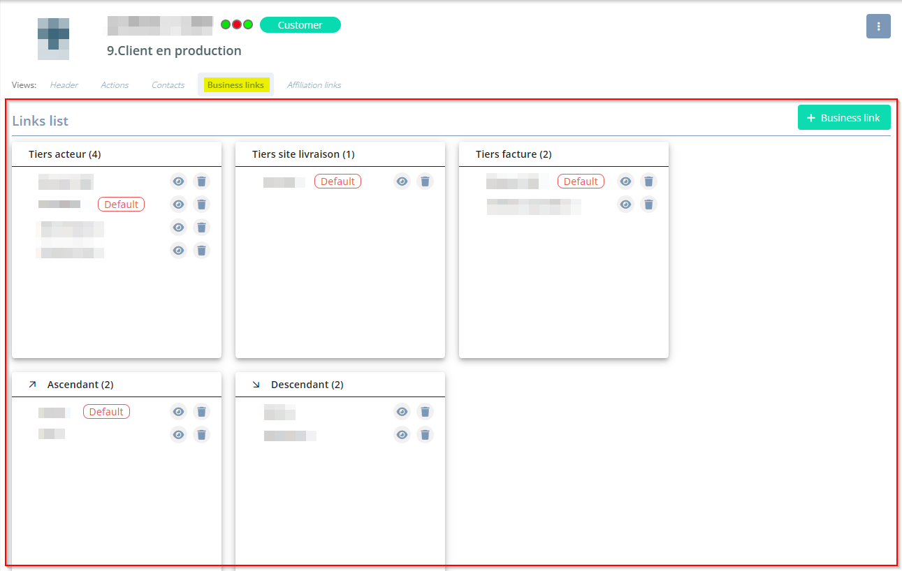 Allows managing the business links of the customer or prospect. Reference For more information about the Business links view, refer to Managing the Business links view of a customer or prospect. |