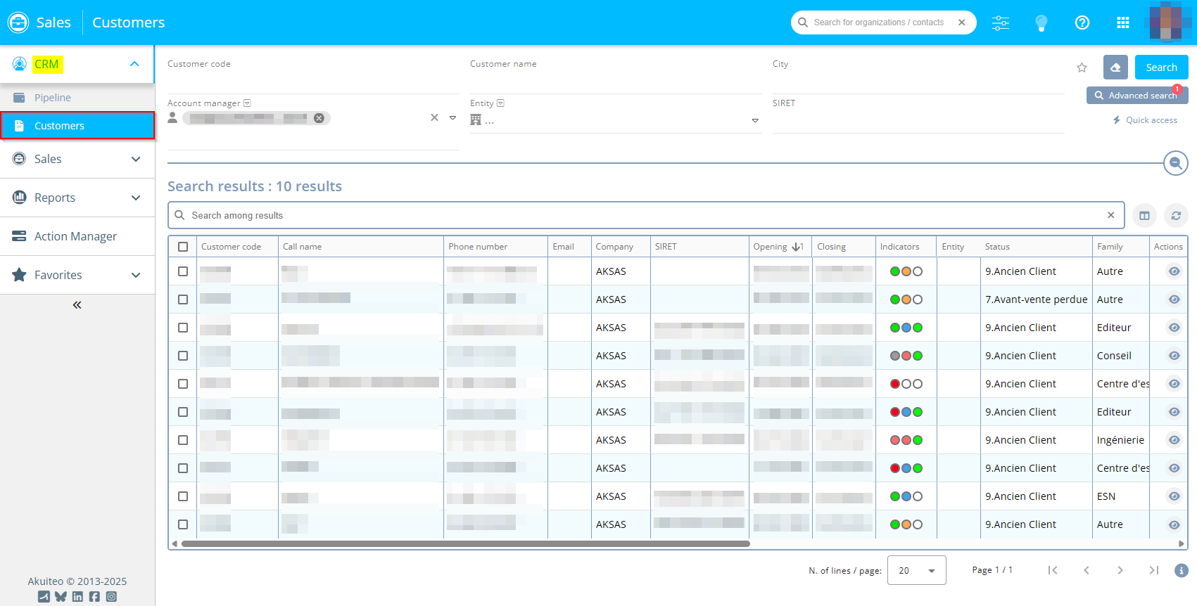 Search results are then displayed in a table. These results can be used by employees to only display relevant information, for example by sorting the customers and prospects or exporting the results under Excel.