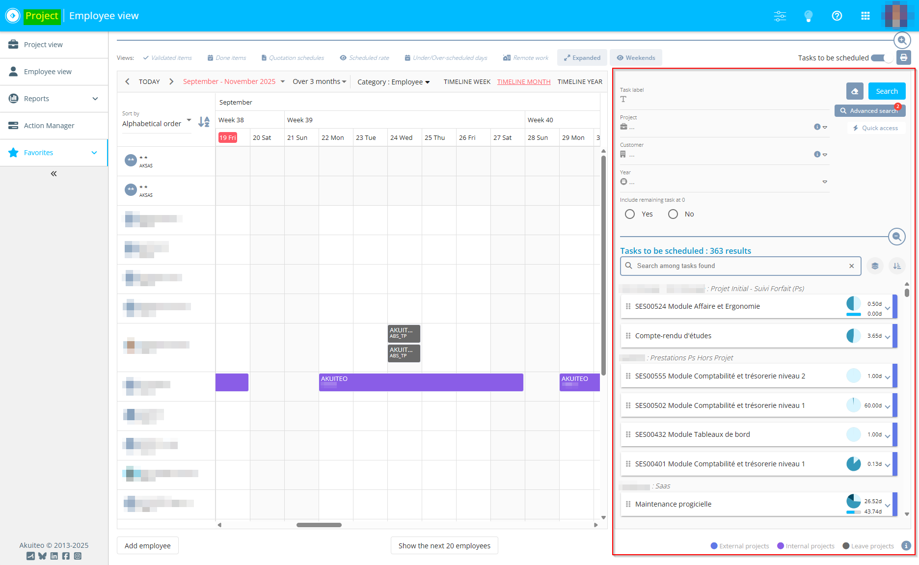 The Project portal enables you to access the list of tasks to be scheduled based on the selected view, timeline and criteria. The list of tasks to be scheduled can be accessed from the Project view, Employee view and Calendar menus. To display this pane, enable the Tasks to be scheduled option at the top of the screen.