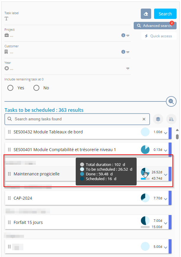 A task to be scheduled is a task which duration to be scheduled (To be sched. field) is greater than 0. If the remaining time to be scheduled of a task is equal to 0, then that task is no longer displayed in the list of tasks to be scheduled.