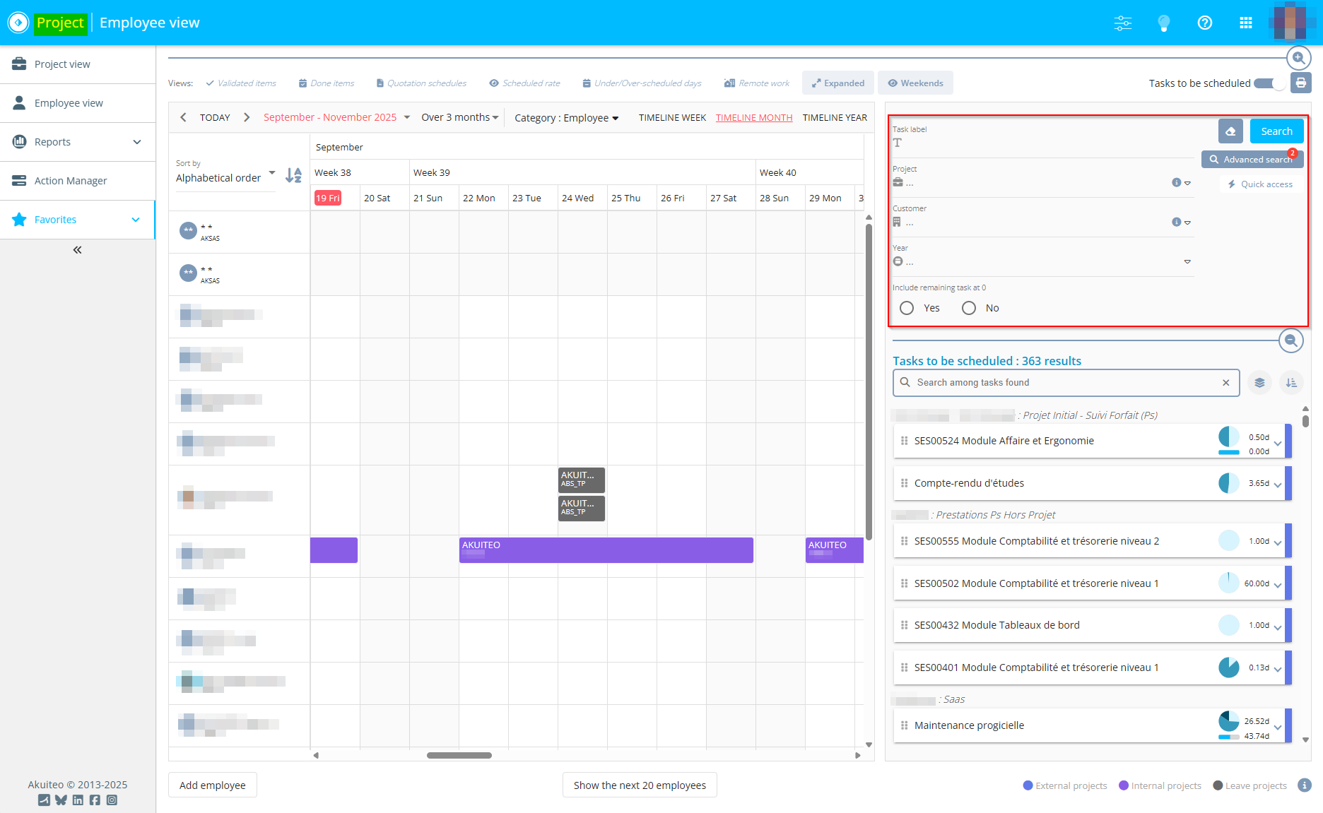 In the Tasks to be scheduled panel, a search interface allows filtering the tasks to be scheduled.