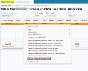 Enfin, il est également possible de mettre à jour les statuts de dématérialisation des factures en lot, depuis les résultats de recherche > clic droit > Modifier le statut de dématérialisation des lignes sélectionnées. Cette fonctionnalité est soumise aux nouveaux DMF 040656 ACHATS FACTURE MISE A JOUR STATUT DEMATERIALISATION et 040728 ACHATS AVOIR MISE A JOUR STATUT DEMATERIALISATION.