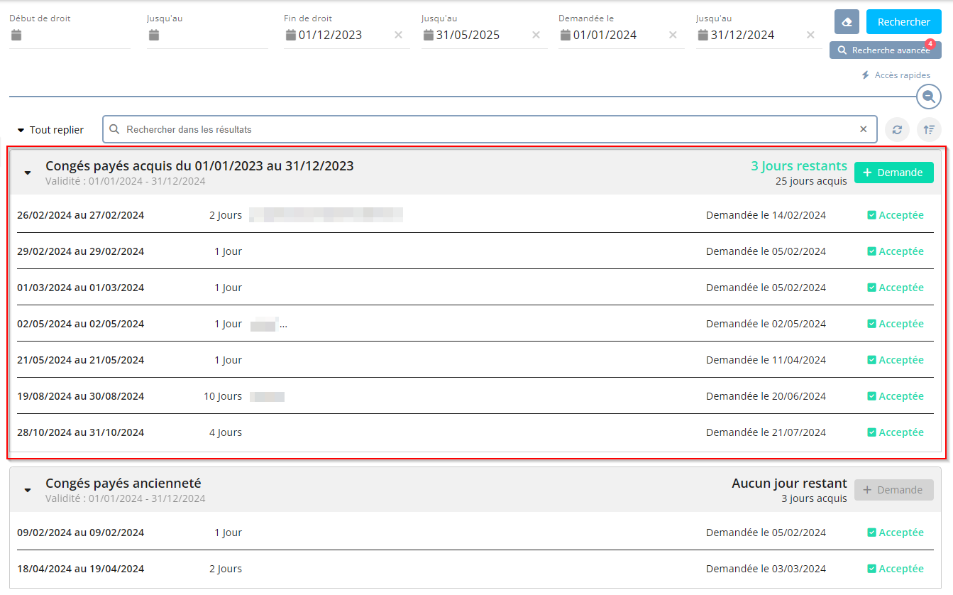 Le menu Demandes d'absence permet d'afficher les compteurs d'absence en fonction des critères de recherche renseignés. Chaque compteur est affiché sous forme de bloc qui contient la liste des demandes d'absence effectuées pour le compteur.